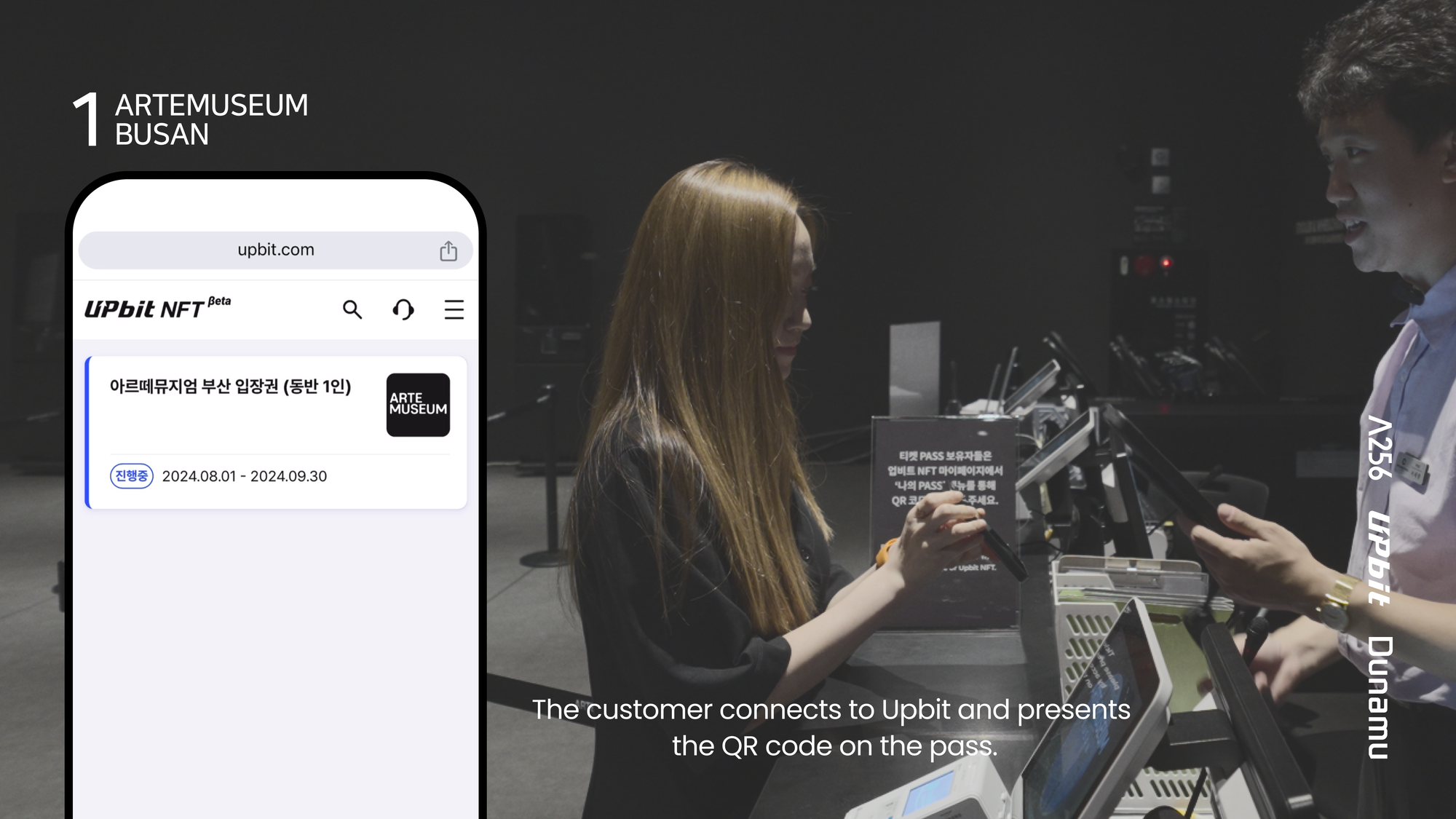 Visitors could receive a free PASS for Arte Museum admission via the Upbit NFT app. Once received, the PASS is securely stored within the app. When visiting the venue, users can activate their PASS to generate a dynamic QR code, which staff scan to verify authenticity. This customer experience is powered by the technology behind Lambda256's Rooto solution.