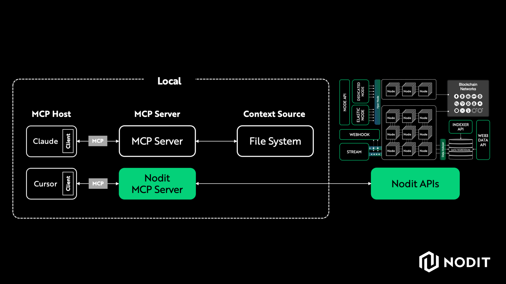 Nodit MCP (Model Context Protocol) acts as an intelligent bridge that allows AI models like Claude or GPT-4 to understand and interact directly with blockchain APIs — including those on the XRPL network. This approach transforms how developers build blockchain applications by enabling AI agents to: