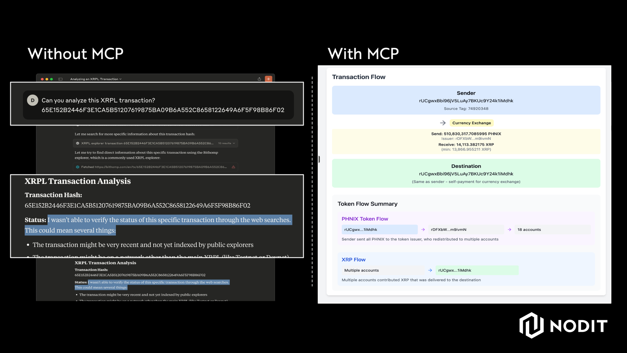 Nodit MCP transforms a vague guesses to verified insights, delivered instantly, no coding required. This empowers XRPL builders to: