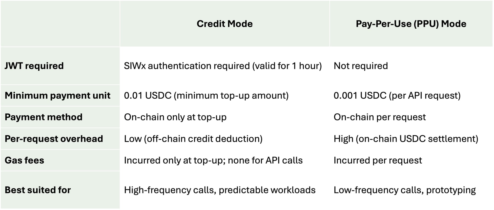 In Credit Mode, USDC is pre-funded and credits are deducted off-chain per API request. This means no on-chain transaction is executed per call, eliminating gas overhead and making it suitable for high-frequency and deterministic workloads.