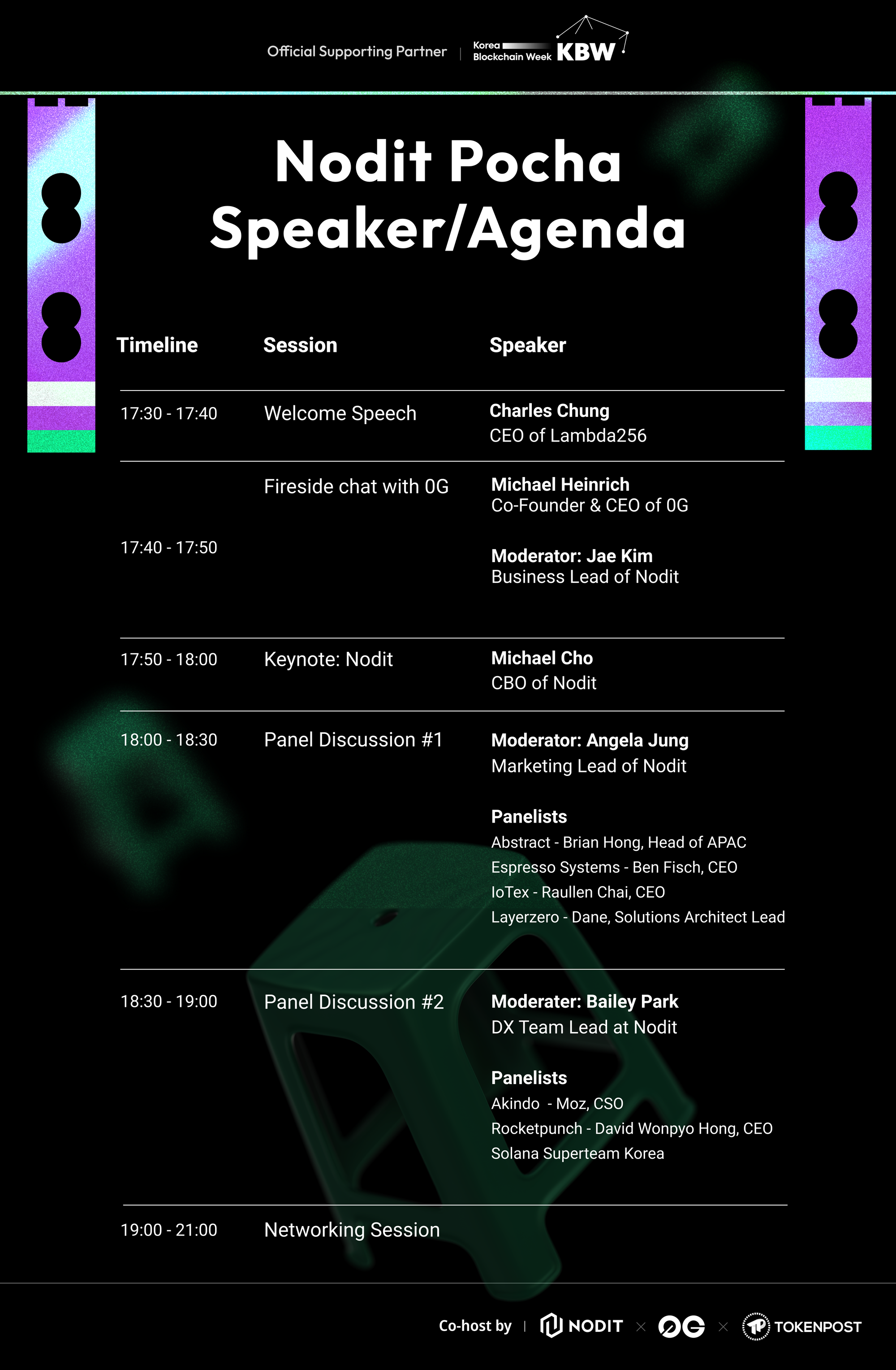 We’re thrilled to invite you to Nodit Pocha, happening on September 24, 2025, at the stylish Cociety Seongsu — one of Seoul’s trendiest cultural venues. This isn’t your usual networking event. It’s a night market–style gathering where global Web3 builders, partners, and developers come together through data, food, and Korean vibes.