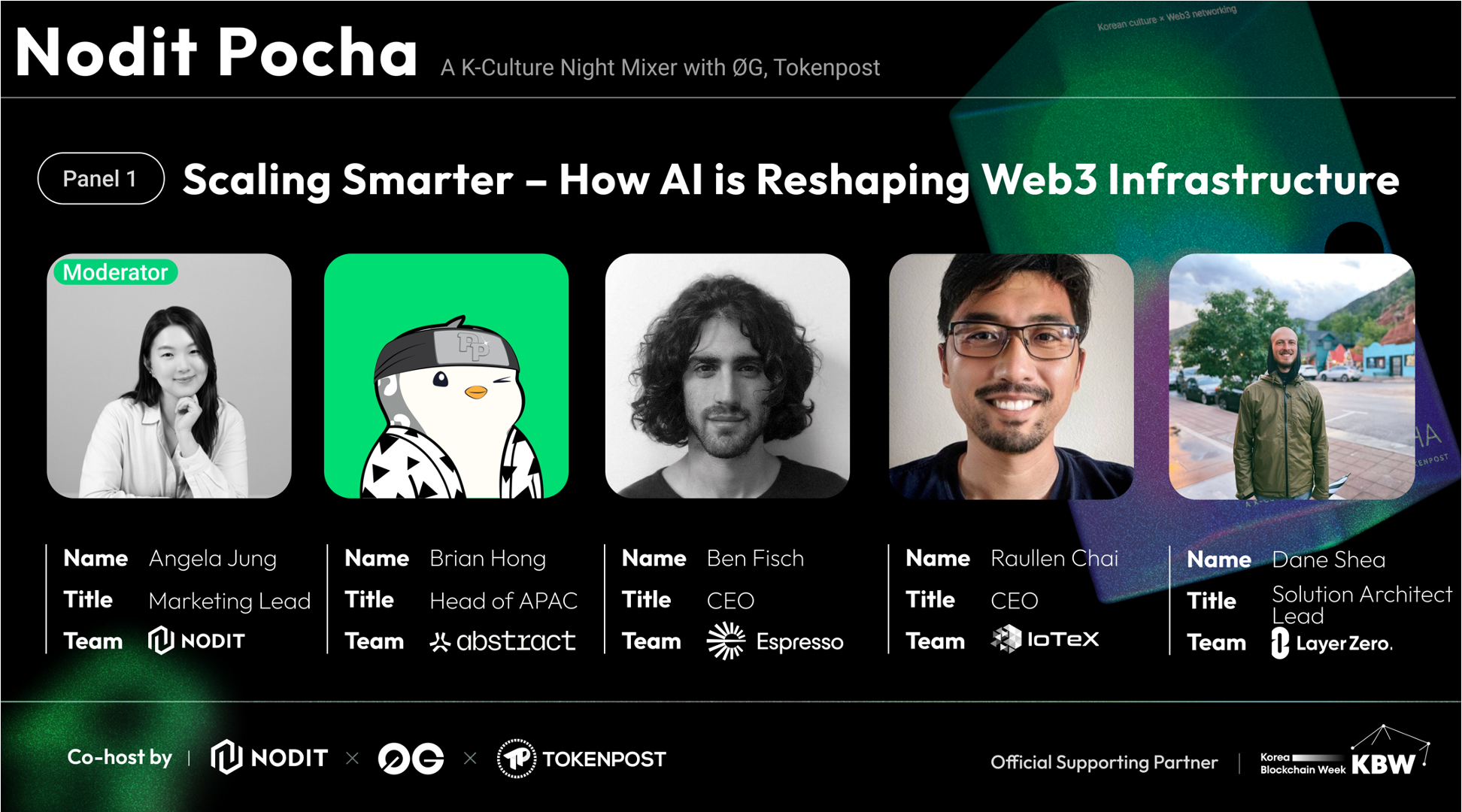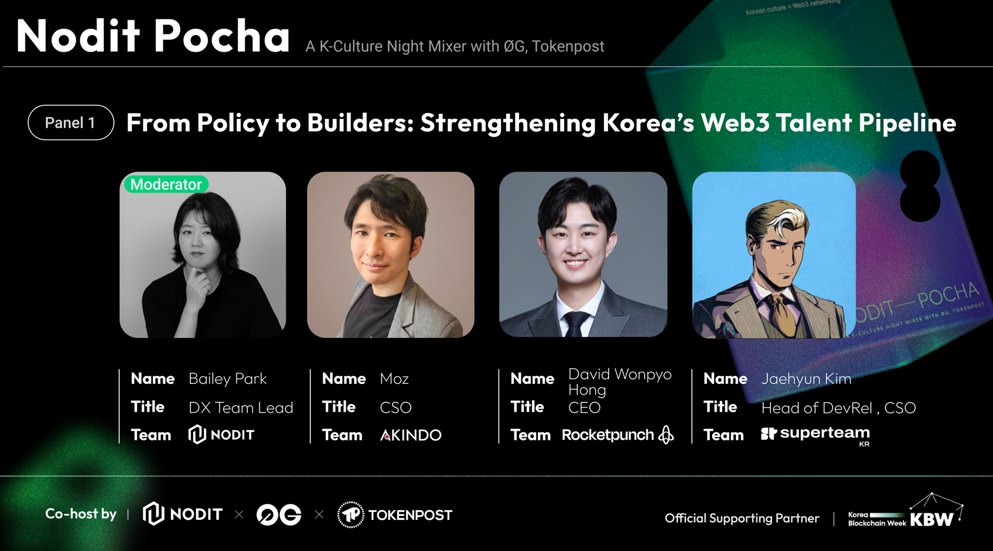 - Nodit Pocha: Our flagship side event with ØG and Tokenpost mixed deep panel discussions on AI, infra, and talent with K-culture vibes — hanbok, K-beauty, and rice wine 🍶.